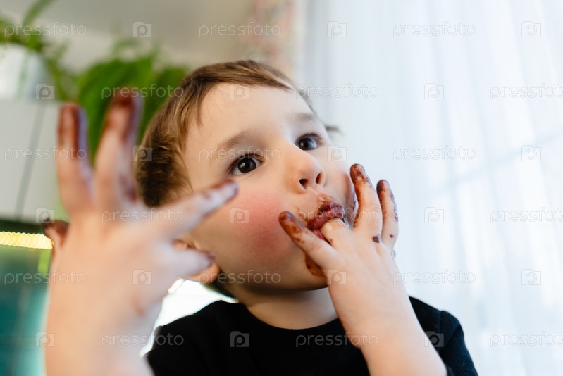 Малыш лижет пальцы, наслаждаясь шоколадом