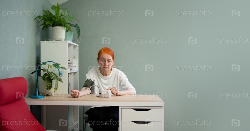 Дальний горизонтальный снимок. пожилая женщина, сидящая за столом в уютной домашней обстановке. копировальное пространство справа, идеально подходит для медицинских сообщений о проверках здоровья пожилых людей, гипертонии или благополучии