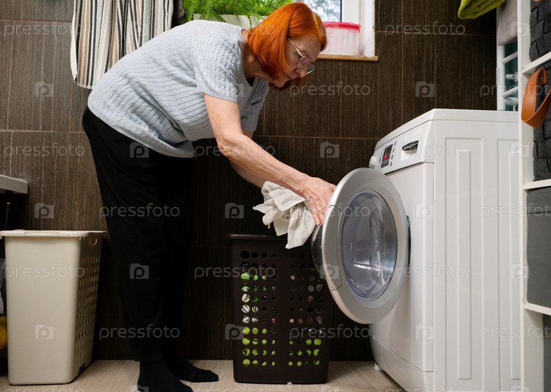 Старшая леди выносит стирку из стиральной машины