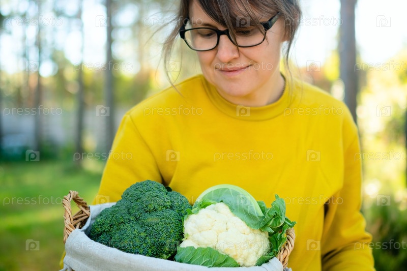 Счастливая женщина-фермерка, держащая плетеную корзину с цветной капустой и брокколи. Сезон урожая, домашние овощи, богатая клетчаткой диета, сезонные продукты и свежие рецепты для здорового питания