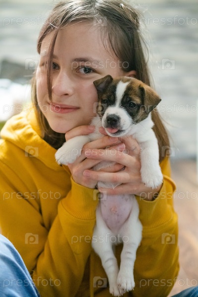 Веселая девочка-подросток дома, счастливо держащая в руках милого щенка Джек Расселл Терьер