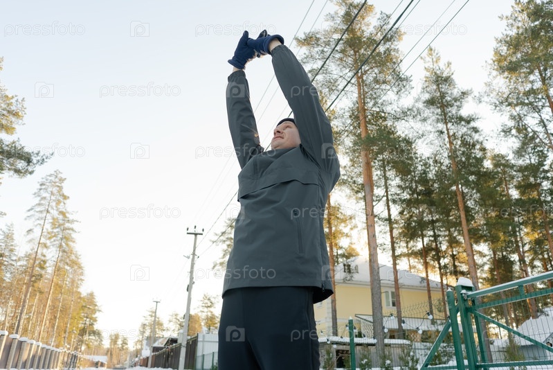 Человек за сорок поднимает руки во время разогрева на открытом воздухе.Мужчина готовится к бегу в холодную погоду, заботясь о гибкости верхней части тела