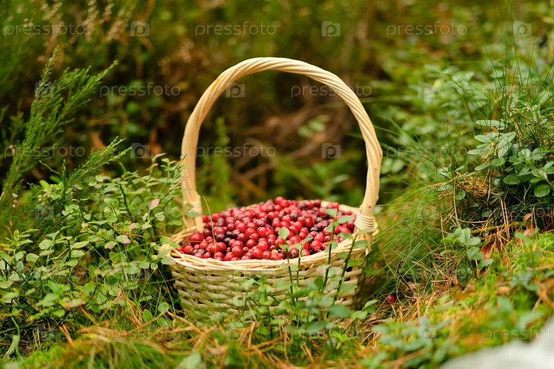 Закрытие полной корзины с созревшими клюквяками среди осенних листьев. лесные дары, натуральные витамины, ягоды для варены, здоровая еда, прогулка по красочному лесу, спокойное осеннее настроение, красивые леса