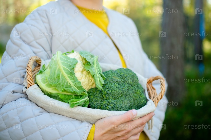 Улыбающаяся женщина-фермерка держит плетеную корзину, полную свежей цветной капусты и брокколи. время сбора урожая, домашние овощи, богатая клетчаткой пища, сезонные продукты и здоровые рецепты овощей