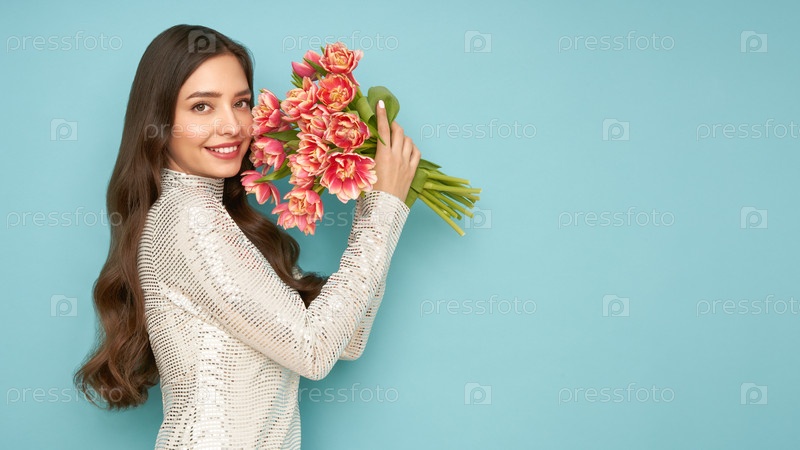 Счастливая женщина красоты с розовым букетом тюльпанов