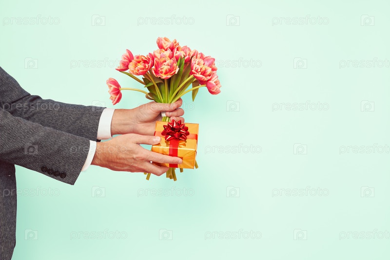 Мужчина преподносит подарочную коробку и букет тюльпанов