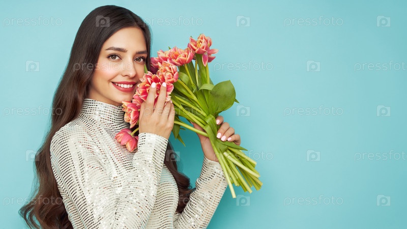 Счастливая женщина красоты с розовым букетом тюльпанов