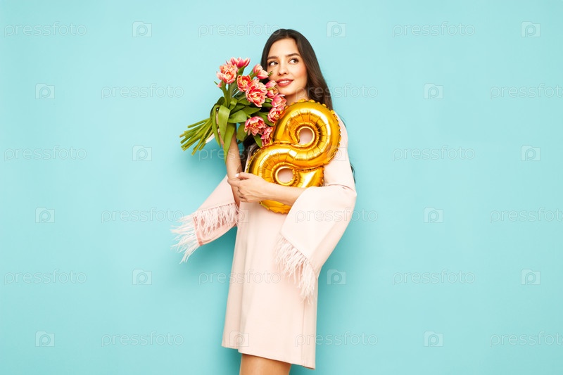 Женщина держит букет цветов и воздушный шар номер 8