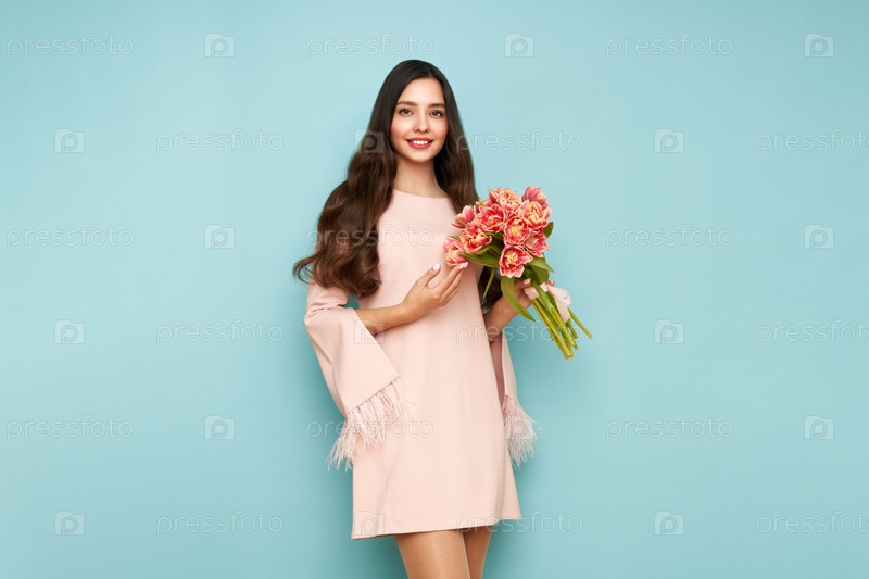 Счастливая женщина красоты с розовым букетом тюльпанов