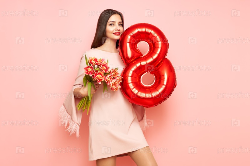 Женщина держит букет цветов и воздушный шар номер 8