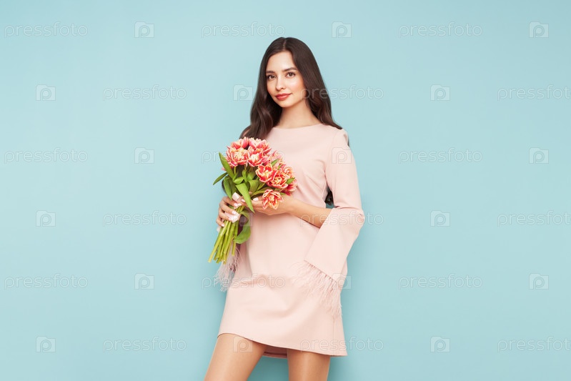 Счастливая женщина красоты с розовым букетом тюльпанов