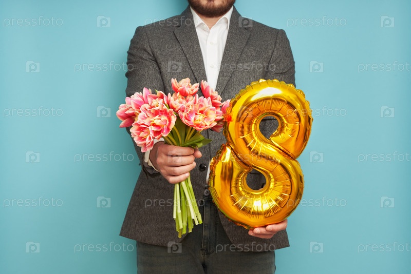Человек с букетом тюльпанов и воздушным шаром номер 8
