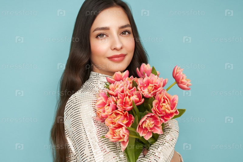 Счастливая женщина красоты с розовым букетом тюльпанов