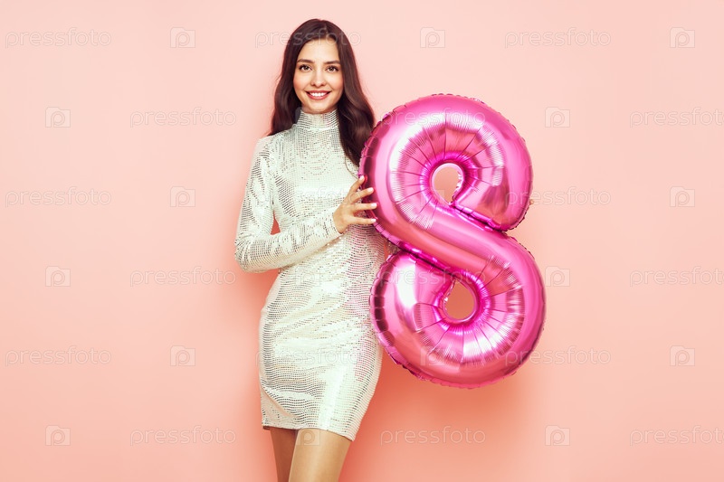 Женщина красоты в праздничном платье держит воздушный шар номер 8