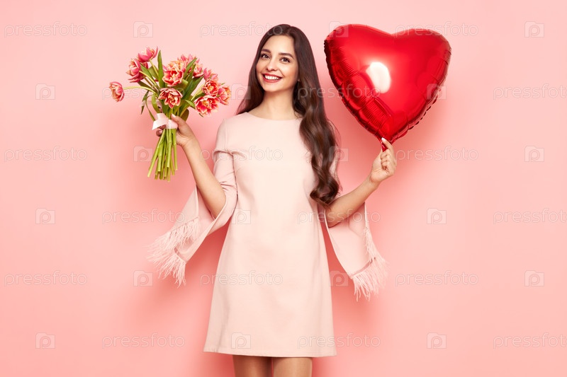 Женщина держит букет цветов и шар в форме сердца