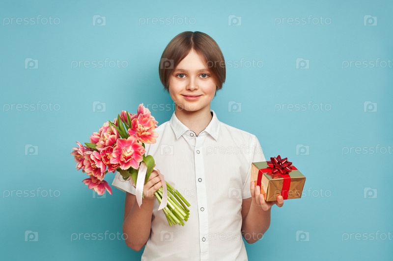 Счастливый ребенок с букетом тюльпанов и подарком