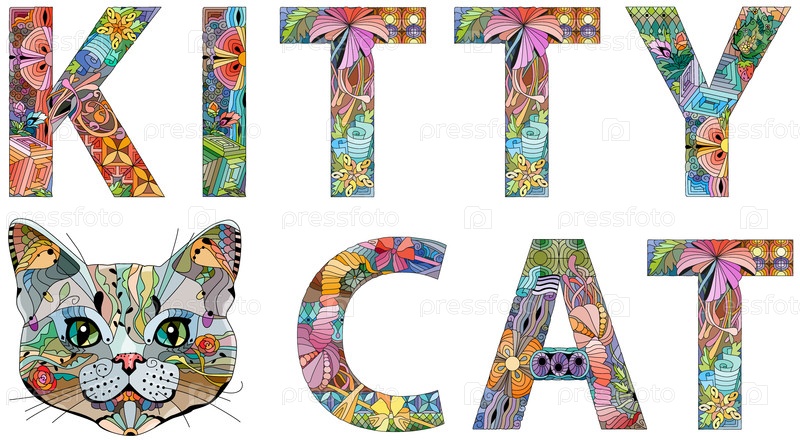 Ручно нарисованный художественный дизайн.Рукописные иллюстративные слова KITTY CAT для футболок и других украшений