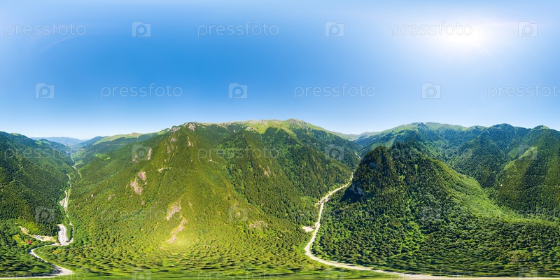 Альтиндере, провинция Трабзон, Турция. Парк Алтиндерской долины. Каменный лес на склонах. Дорога через долину. Панорама 360 x 180. Вид с воздуха