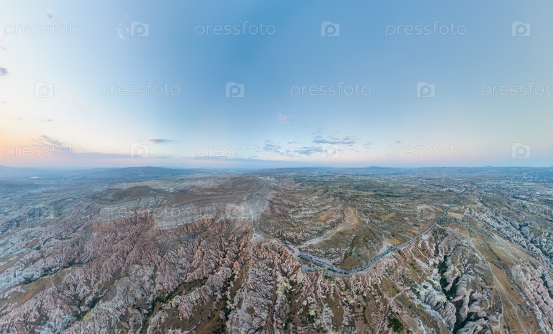 Гореме, Невшехир, Турция.Взгляд с воздуха на видное плато, возвышающееся над ландшафтом Каппадокии с красноватыми склонами и эрозированными вулканическими образованиями вокруг его основания