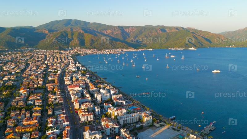 Мармарис, Турция. залив мармарис с яхтами, городом и пляжами на закате. полный прибрежный ландшафт с городской средой в теплом вечернем свете.. взгляд из воздуха