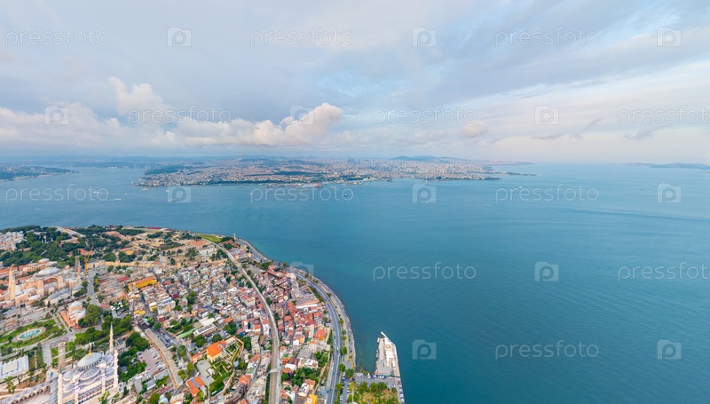 Стамбул, Турция. Исторический центр города. Набережная. Босфор и район Фатих. Облачная погода на закате солнца. Вид с воздуха