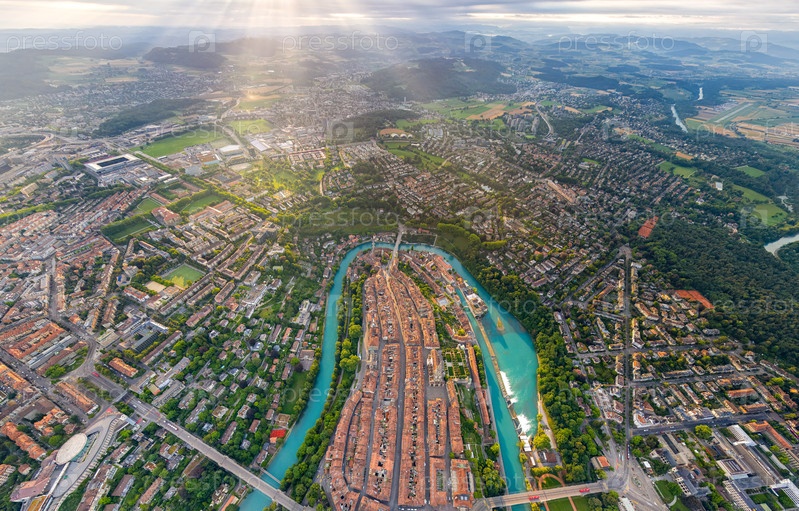 Берн, Швейцария.Панорама города в пасмурную погоду.Солнечные лучи.Летнее утро.Вид с воздуха