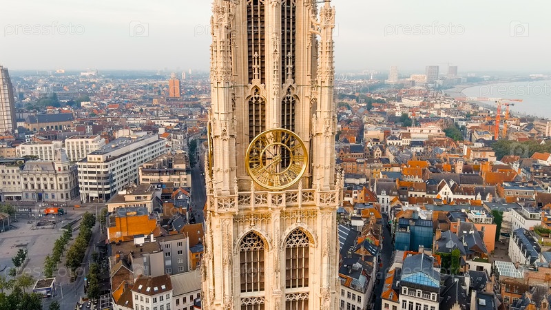 Антверпен, Бельгия. шпиль с часами собора Богоматери (Антверпен). Исторический центр Антверпена. Город расположен на реке Шелде (Эскаут). Летнее утро, Aerial View