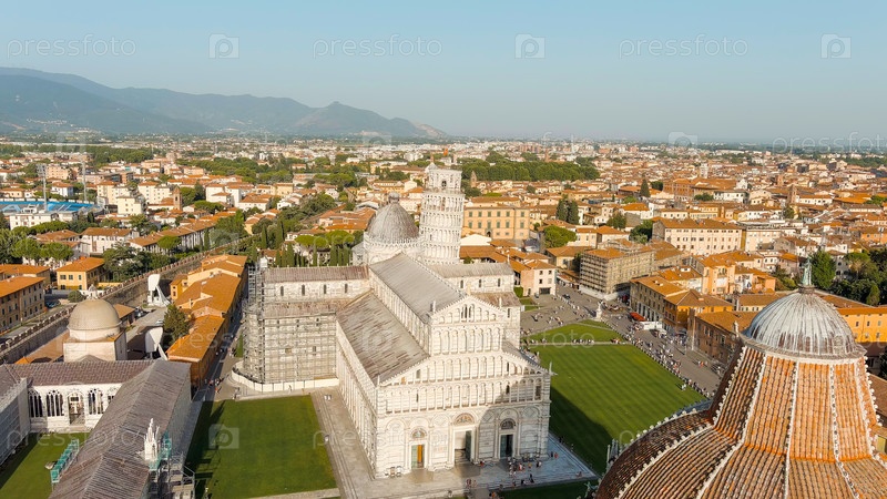 Пиза, Италия. знаменитая наклонная башня и пизанский собор в Пьяцце-дей-Мираколи. лето. вечерние часы, взгляд с воздуха