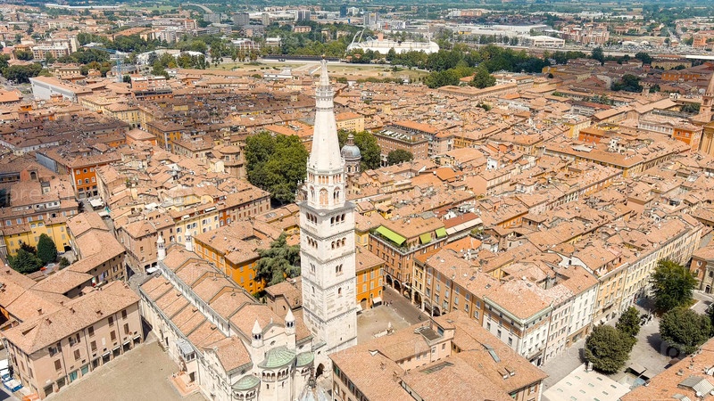 Модена, Италия. Собор Модены. Знаменитый романский собор с колокольницей. Исторический центр. Летом, взгляд из воздуха