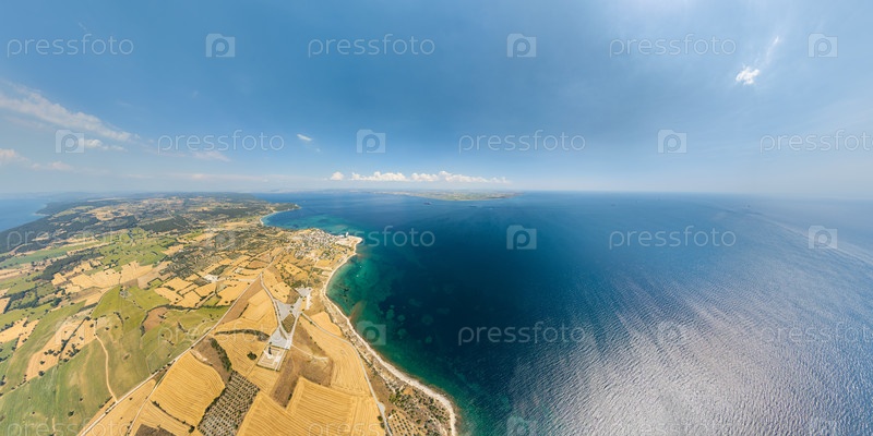 Вид с воздуха мыса Хелес и мыса Теке с пляжами высадки Второй мировой войны S, V, W, X, Y и мемориалами на полуострове Галлиполи у входа в Дарданеллы
