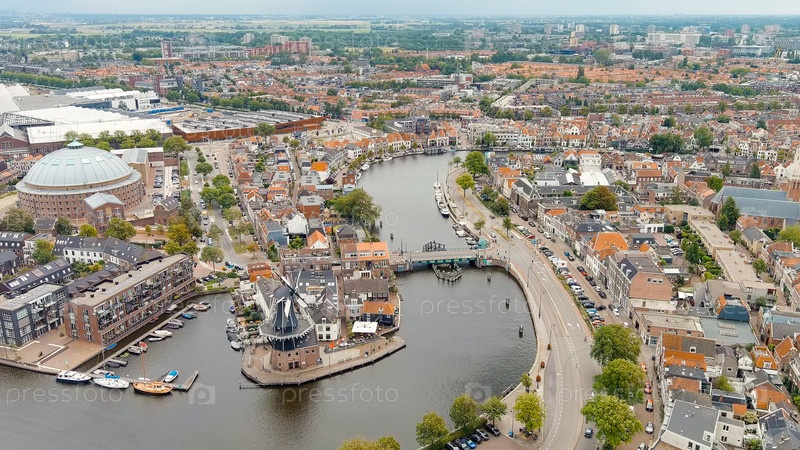 Ветряная мельница De Adriaan (1779). ветряная мельница XVIII века. панорамный вид на центр города Haarlem. облачная погода в течение дня. лето, Aerial View