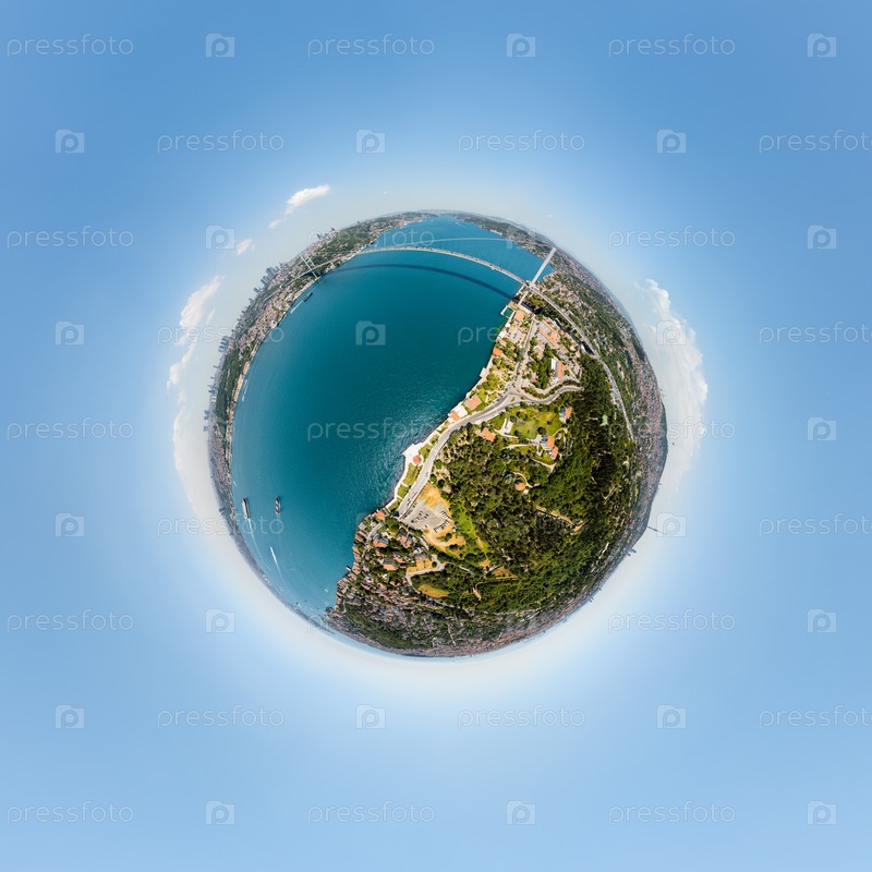 Стамбул, Турция. Городской пейзаж Бешиктаса и Ускудара на европейской и азиатской сторонах пролива Босфор с мостом мучеников 15 июля. Панорамный вид из воздуха в полдень. 360-градусная панорама астероида