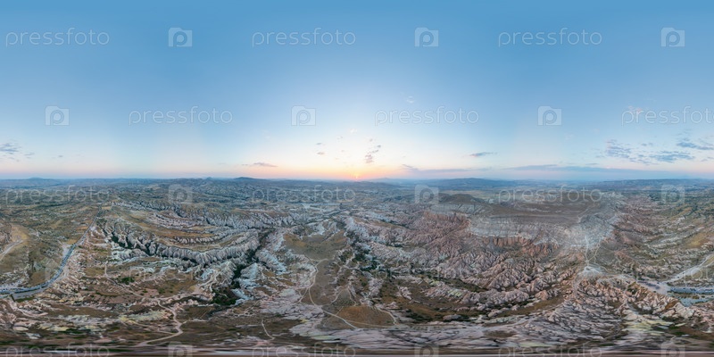 Гореме, Невшехир, Турция. сферическое плато Каппадокии с солнцем уменьшенным до точки на горизонте, голубые тона доминируют над небом с разбросанными облаками над расчлененными долинами. Панорама 360x180