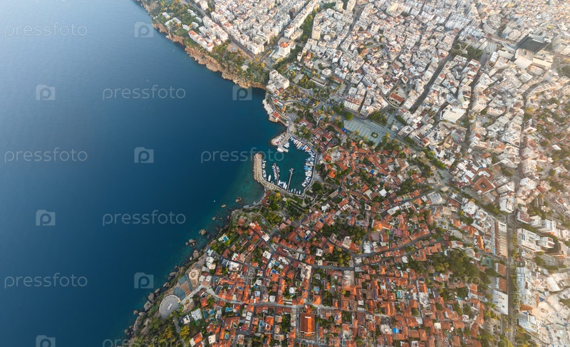 Состав воздушного дрона исторического Старого города Калейчи, яхт-марина, современные жилые районы, прибрежный парк и скалистая береговая линия летом утром