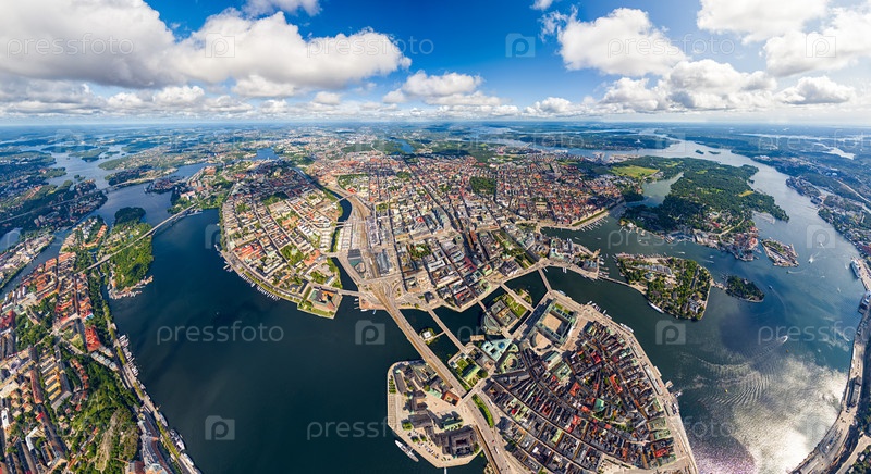 Стокгольм, Швеция.Риддархольмен.Панорама города летом в пасмурную погоду.Вид с воздуха