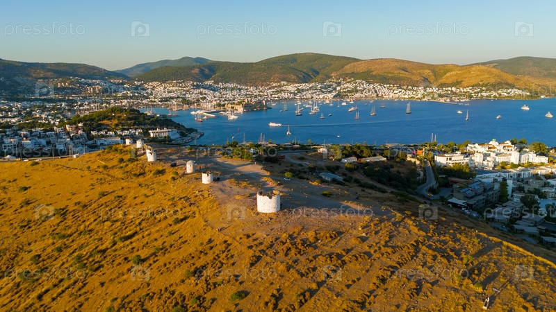 Панорама исторических ветряных мельниц Бодрума на холме с бухтой, горами, белыми домами и яхтами в Турции