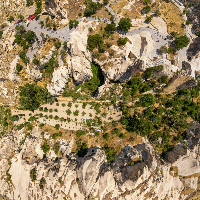 Гореме, Невшехир, Турция.Взгляд сверху вниз из воздуха на долину Горэма, показывающий сложные узоры сказочных дымоходов, эрозии и геологических образований в Каппадокии