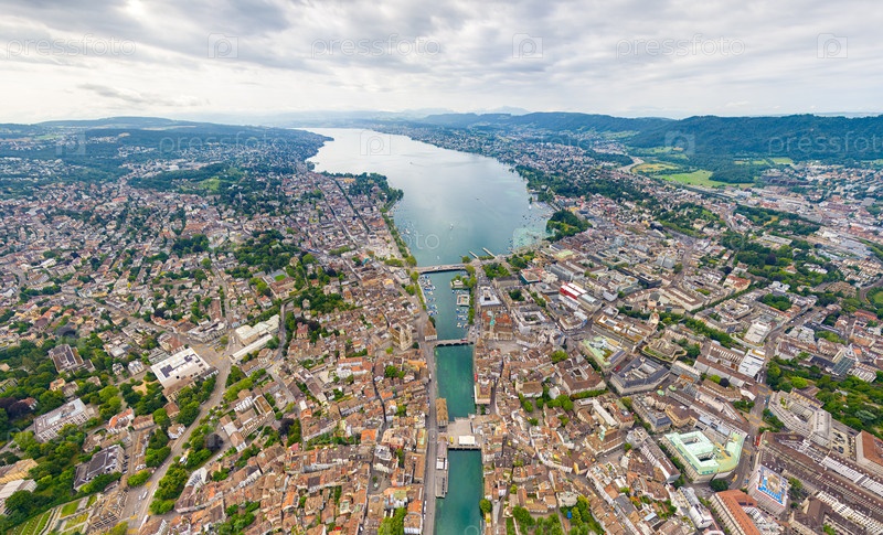 Цюрих, Швейцария Панорама города в пасмурную погоду Летний день Вид с воздуха