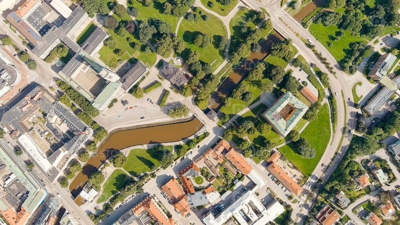 Вастерас, Швеция.Центральная часть города.Река Свартан (Svartan).Летний день, Aerial View