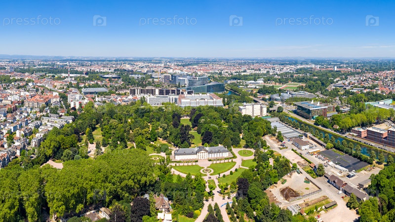Страсбург, Франция. Парк Оранжри. Европейские административные здания. Панорама центра города. Вид с воздуха, Лето
