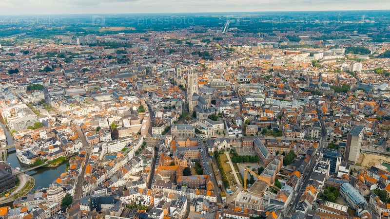 Гент, Бельгия. собор Святого Баво. панорама центрального города с воздуха. облачная погода, летний день, Aerial View Gh