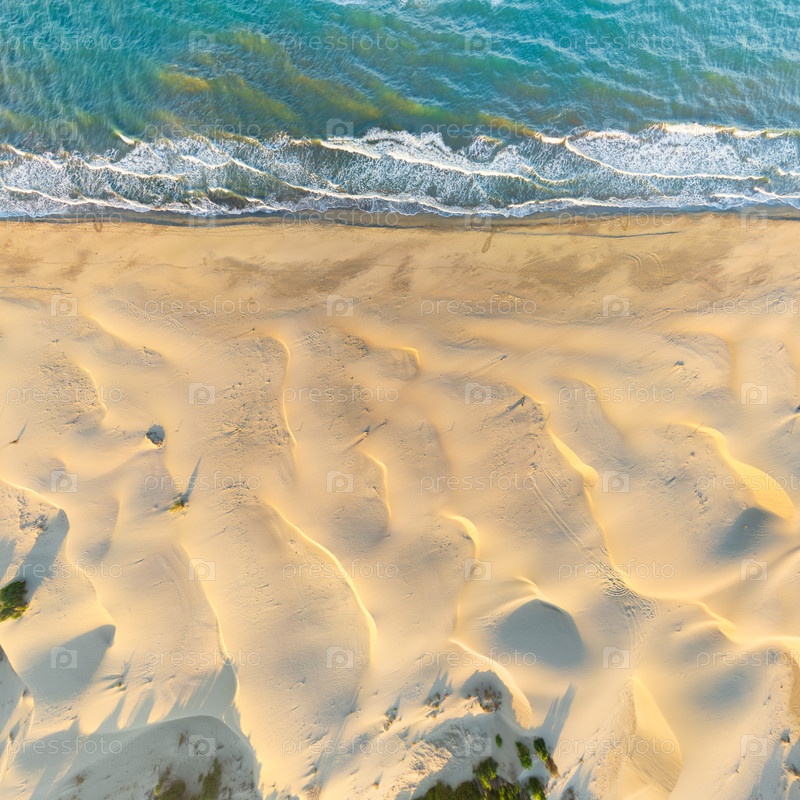 Гелемис, Турция.Взгляд сверху вниз из воздуха на паттерны волн на песке пляжа Патара, пенообразование встречи берега при утреннем свете, летнее побережье