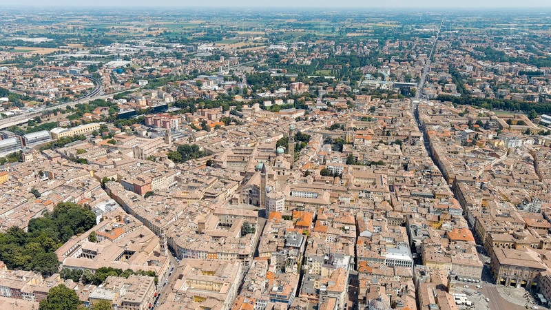 Парма, Италия. Исторический центр Пармы. Собор Пармы. Панорама города с воздуха. Летний день, Aerial View Par