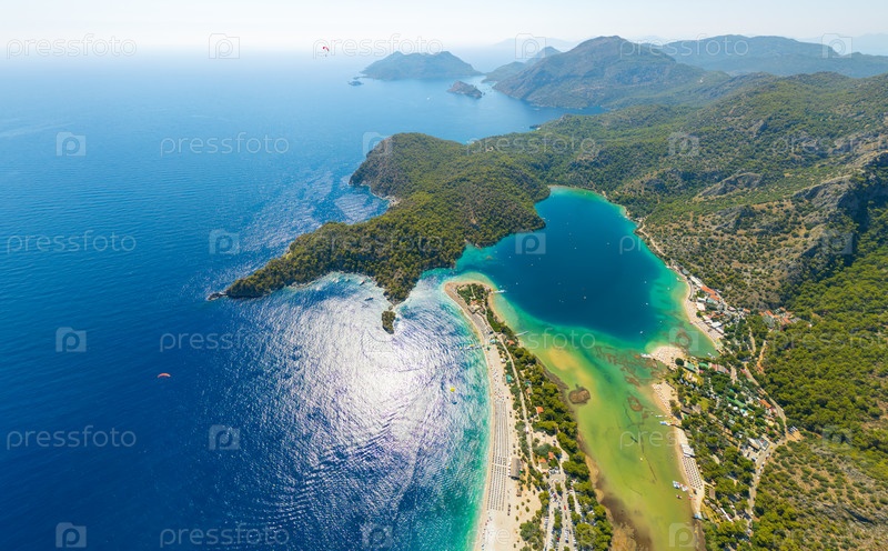 Панорамный вид из воздуха на Голубую лагуну с бирюзовыми водами, галечными пляжами, Средиземным морем и лесистыми горными хребтами летом