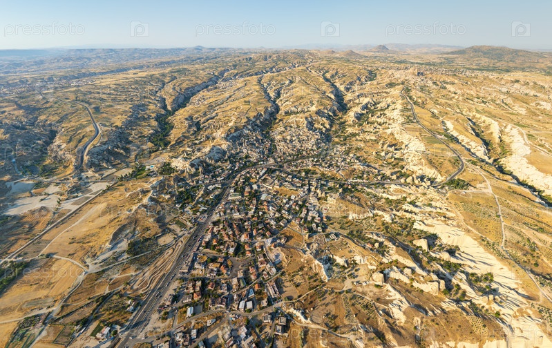 Широкий панорамный вид на город Гореме, расположенный в вулканическом плато, окруженный глубоко эродированными долинами и уникальными скальными образованиями при позднем утреннем свете