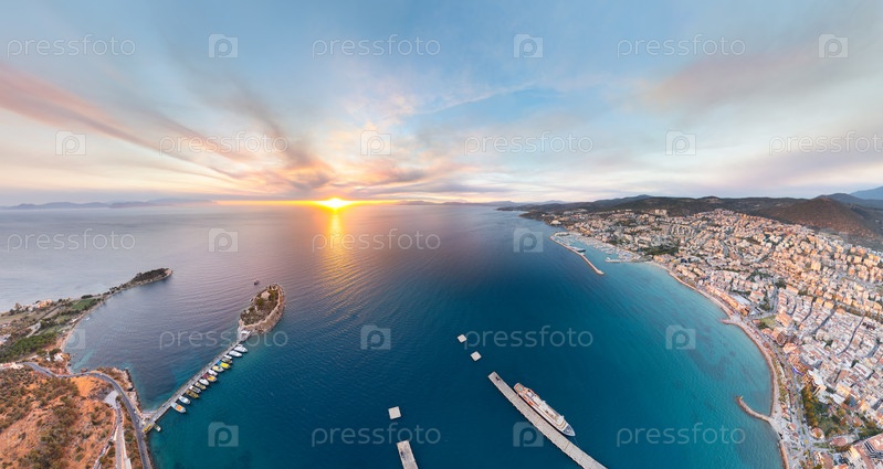 Кусадаси, Турция.Панорама с воздуха на остров Голубей, круизный порт с кораблем, солнце, бухта, марина и пляжи с прогулочной площадкой.Прибрежный городской пейзаж.Вид с воздуха