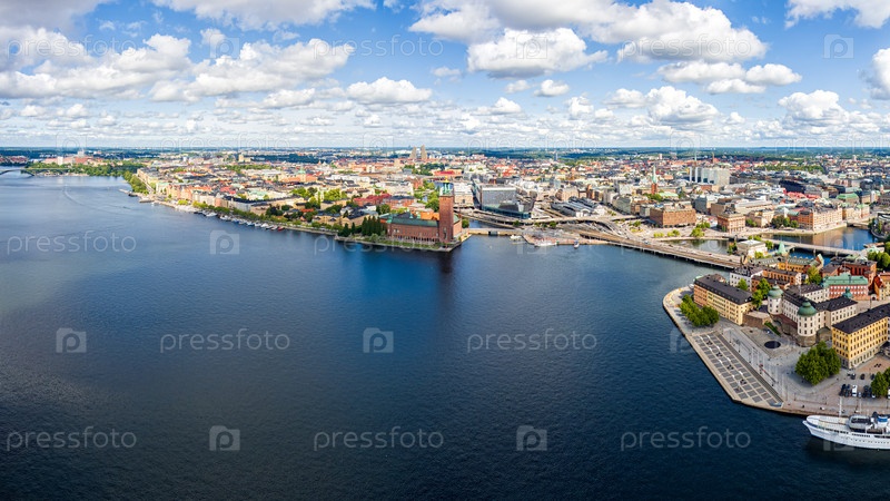 Стокгольм, Швеция. Стокгольмская ратуша. Панорама города летом в пасмурную погоду. Вид с воздуха