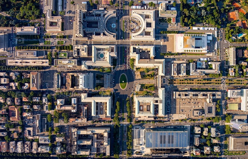 Рим, Италия. Всемирный выставочный квартал - EUR. Панорама города летом утром. Солнечная погода. Вид с воздуха
