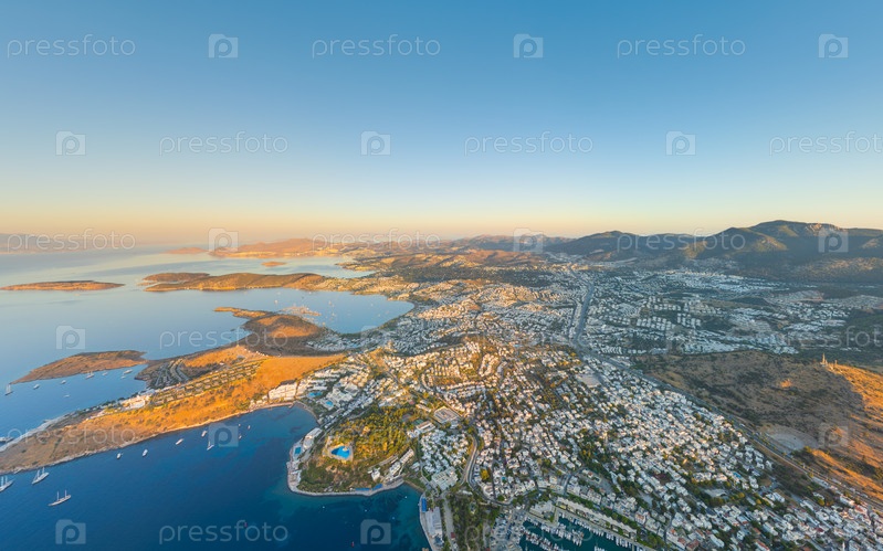 Утренняя воздушная панорама змеиного побережья, где лазурные воды обнимают белый городской пейзаж, создавая драматические бухты и прибрежные узоры