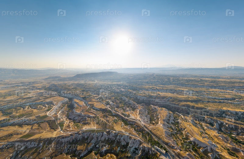 Панорама с воздуха плато Каппадокии, выделяющая текстурированные вулканические поверхности и глубоко резкие долины под ярким утренним солнечным светом